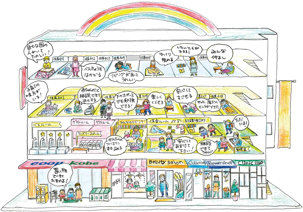 シングルマザー、若年女性や女子学生・留学生など様々な事情から住宅確保が難しい状況にある女性を対象に「ここにしか住めない」ではなく「ここに住みたい」と思える住まいをつくることを目指した共同住宅です。